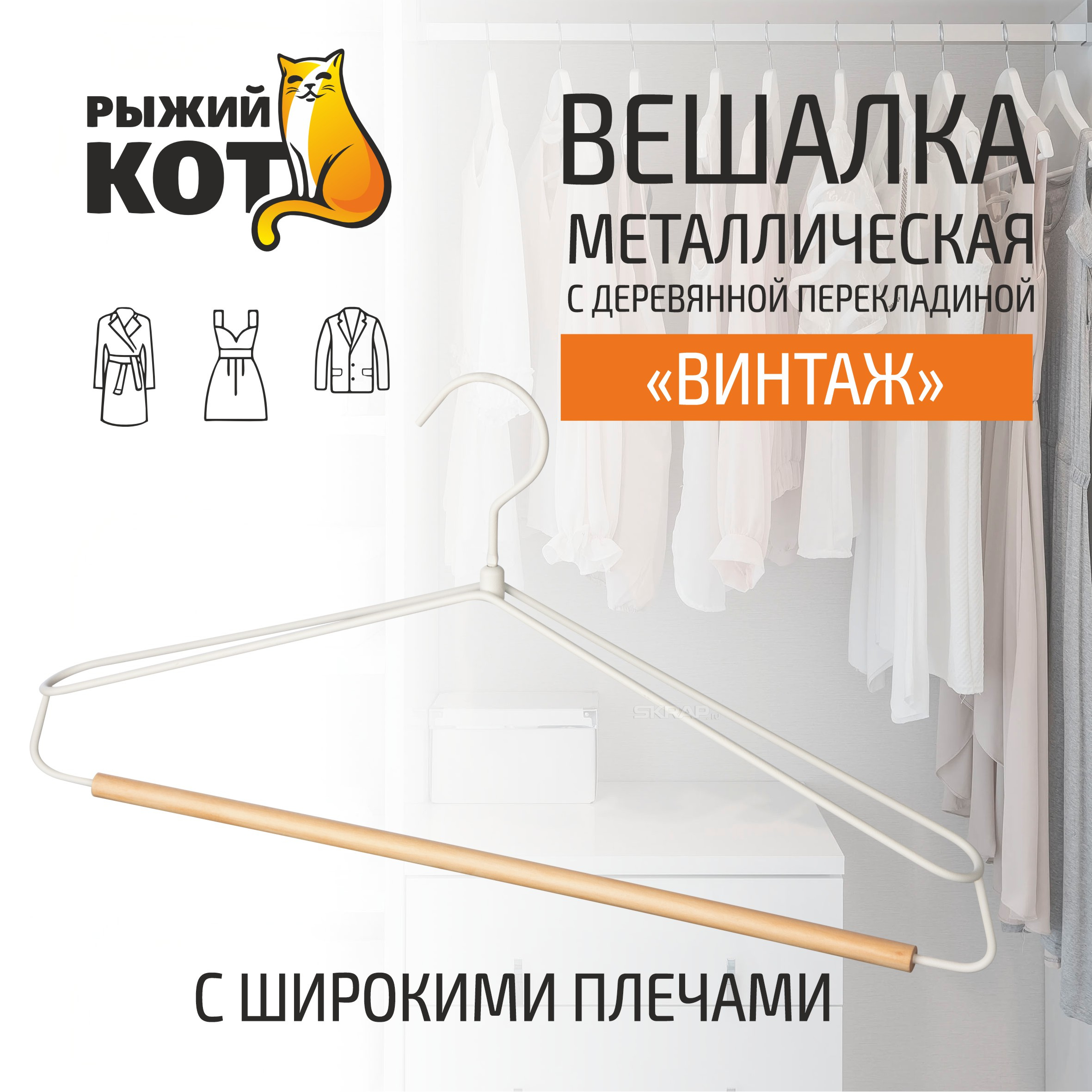 Вешалка металлическая с деревянной перекладиной "Винтаж" с широкими плечами, цвет белый